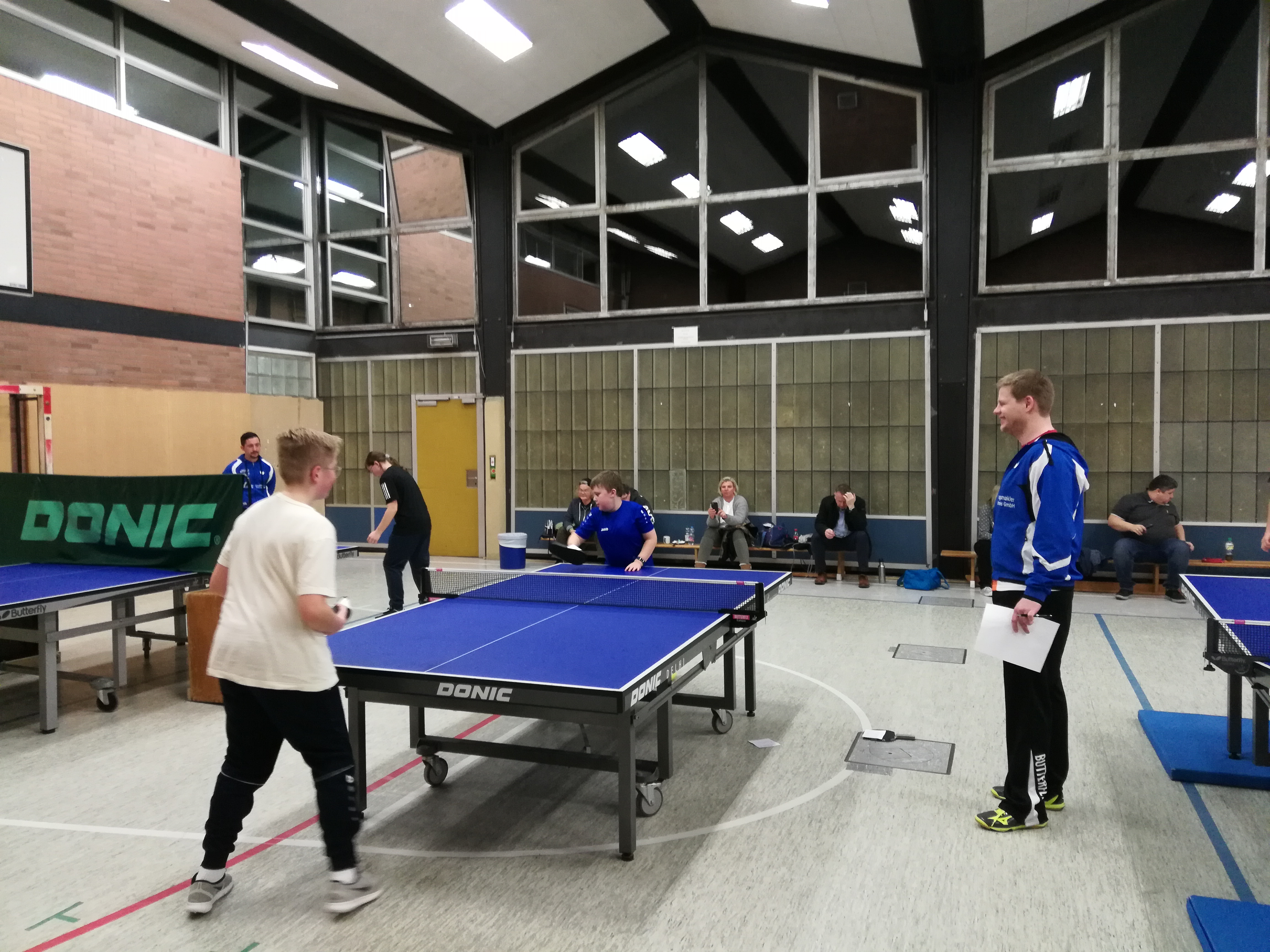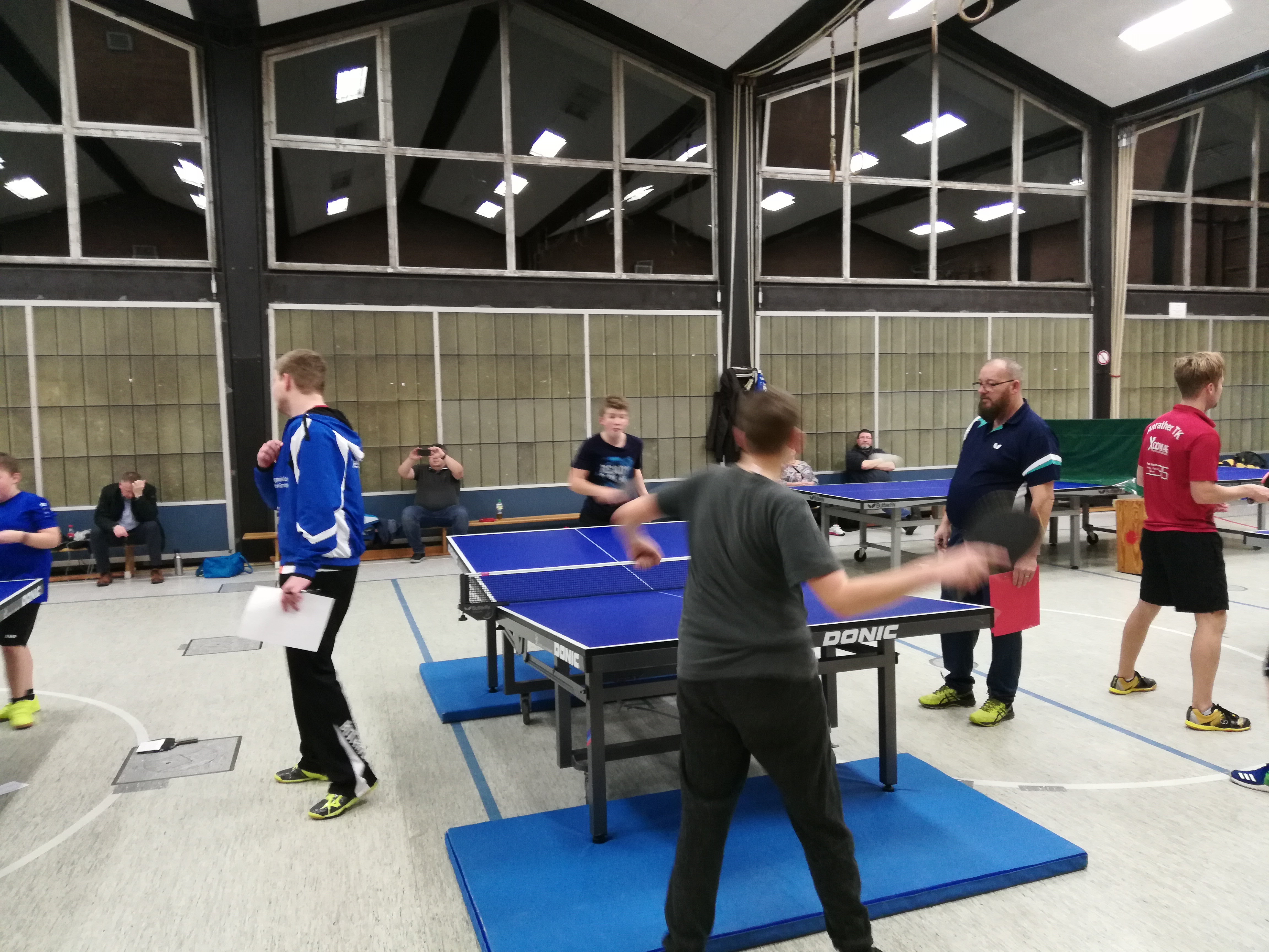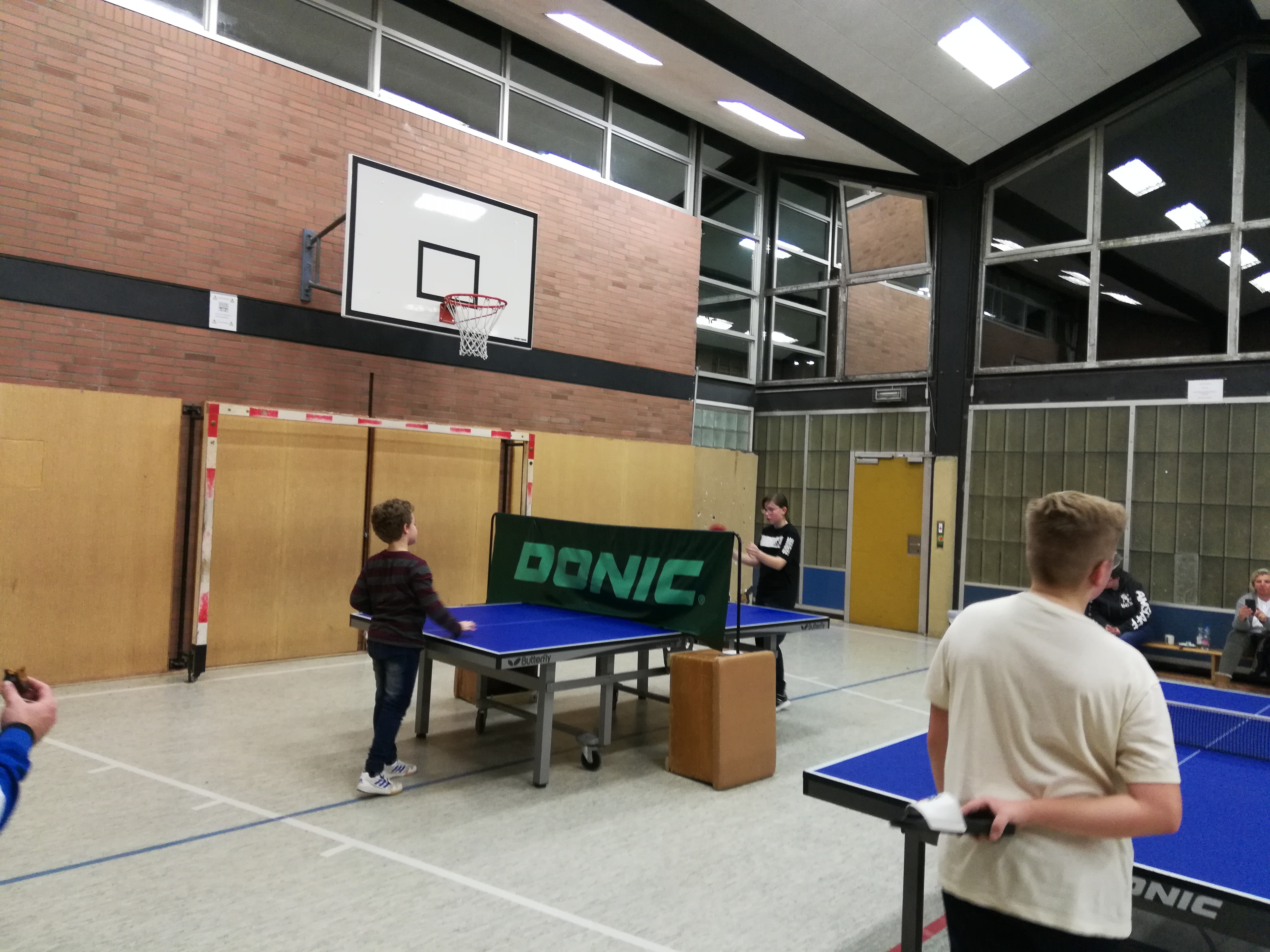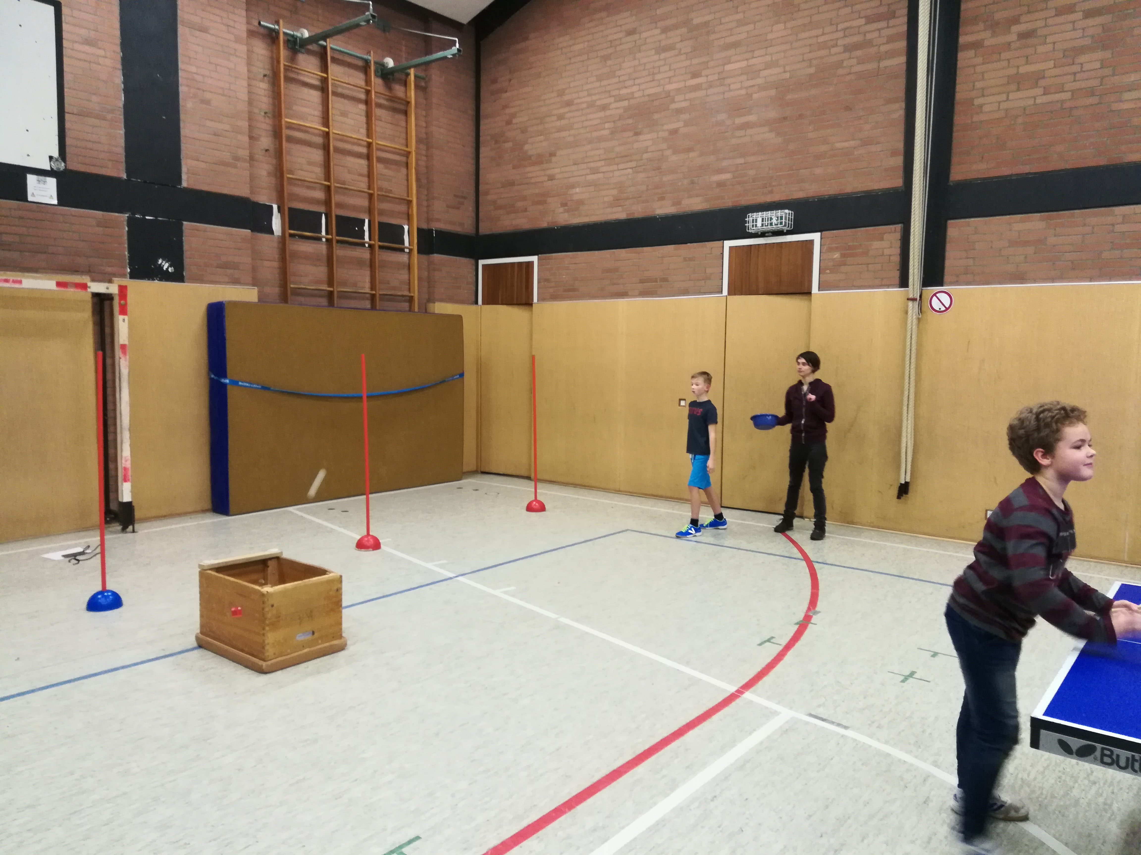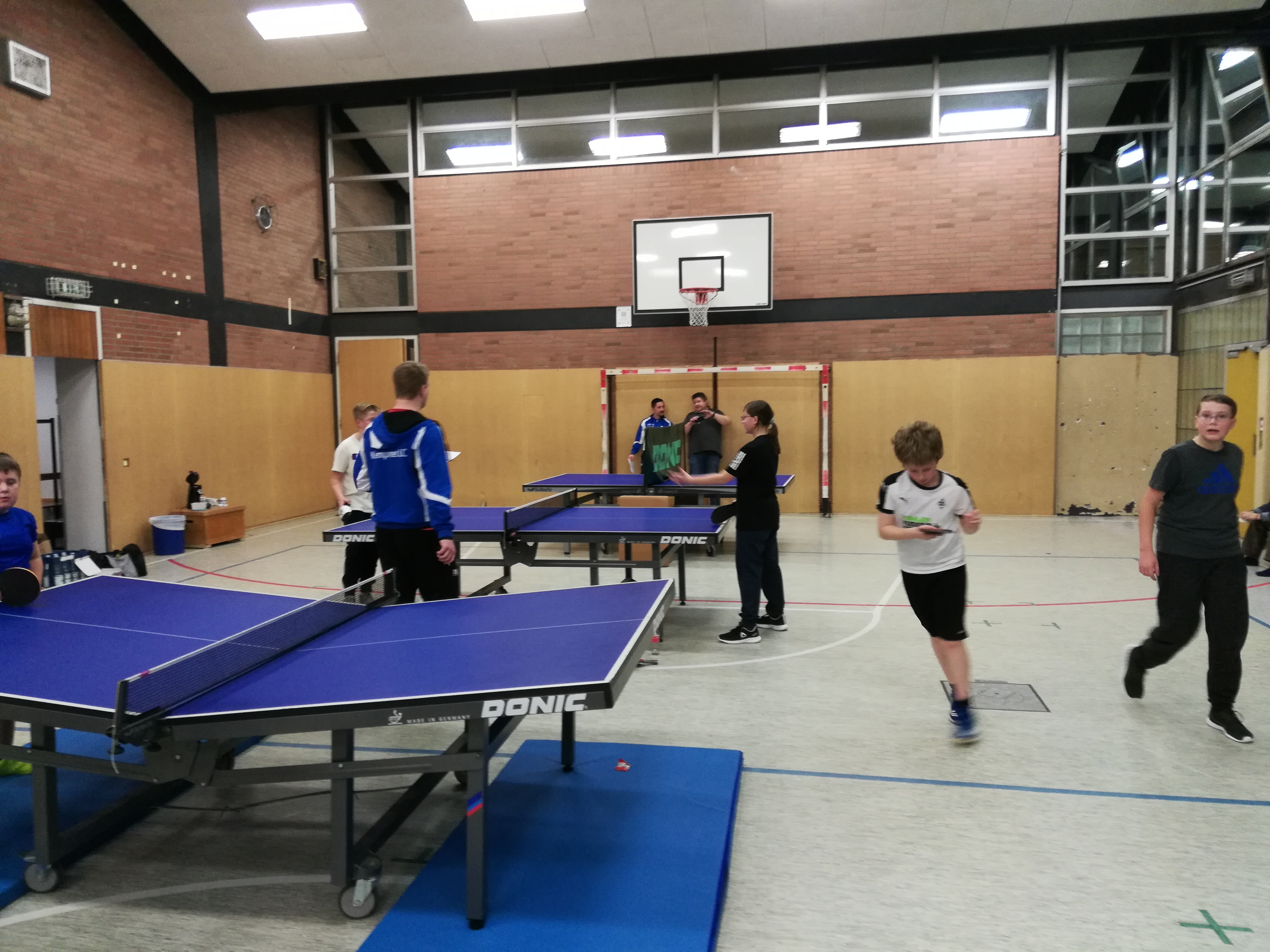 Am gestrigen Dienstag hat die Tischtennisabteilung ein Weihnachtsjuxturnier für die Jugendabteilung durchgeführt. Dabei waren verschieden Stationen in der Turnhalle der Gesamtschule aufgebaut. An den Tischtennistischen mussten in ungewohnten Formen Übungen absolviert werden. So gab es einen Grabentisch, wo die beiden Hälften der Tische nicht wie gewohnt aneinander standen, sondern durch einen Graben getrennt waren. An einem anderen Tisch bestand das Netz aus einer ca 75 cm hohen Absperrung, daneben war ein Tisch aufgebaut, an dem mit Badelatschen Tischtennis gespielt werden musste. An einem weiteren Tisch waren die Enden des Tisches jeweils erhöht worden, sodass die Kinder hier mit ungewöhnlichem Absprungverhalten konfrontiert waren. Dann gab es noch die Übung des Slaloms zu bewältigen und schließlich mussten die Kinder den Tischtennisball in einen umgedrehten kleinen Kasten aus einer Entfernung von 3 m befördern. Für alle Übungen gab es Punkte zu ergattern, die auf einer Laufkarte festgehalten wurden. Und damit alle Kinder die gleiche Chance auf einen Sieg hatten, bekamen diejenigen, die noch nicht allzu lange dabei sind Bonuspunkte.